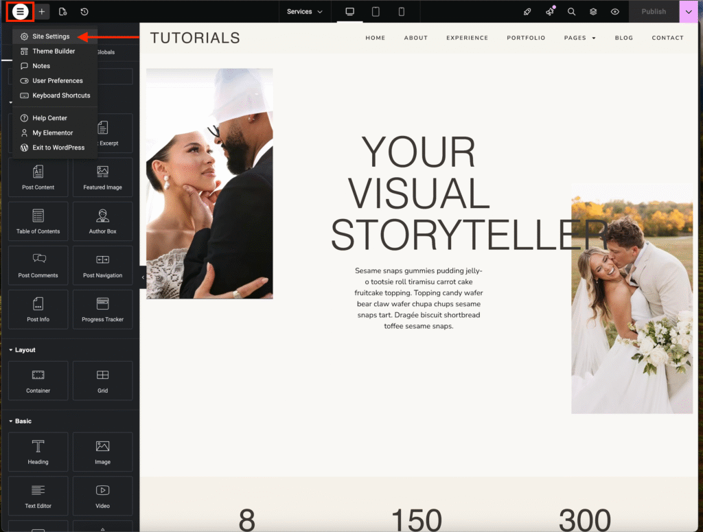 • In the Elementor editor, click the hamburger menu in the top-left corner and select Site Settings.