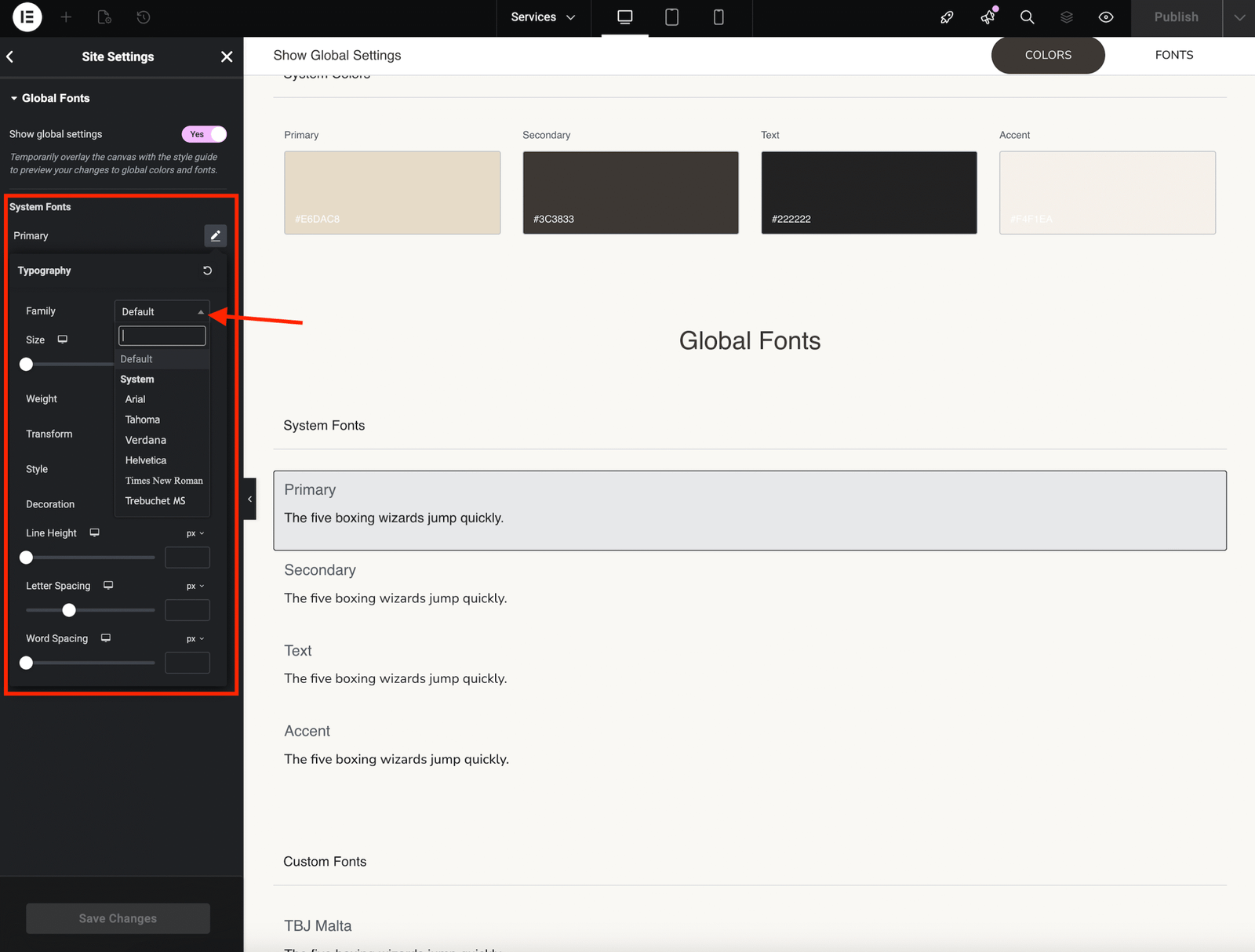 • You will see four font options: Primary, Secondary, Text, and Accent.