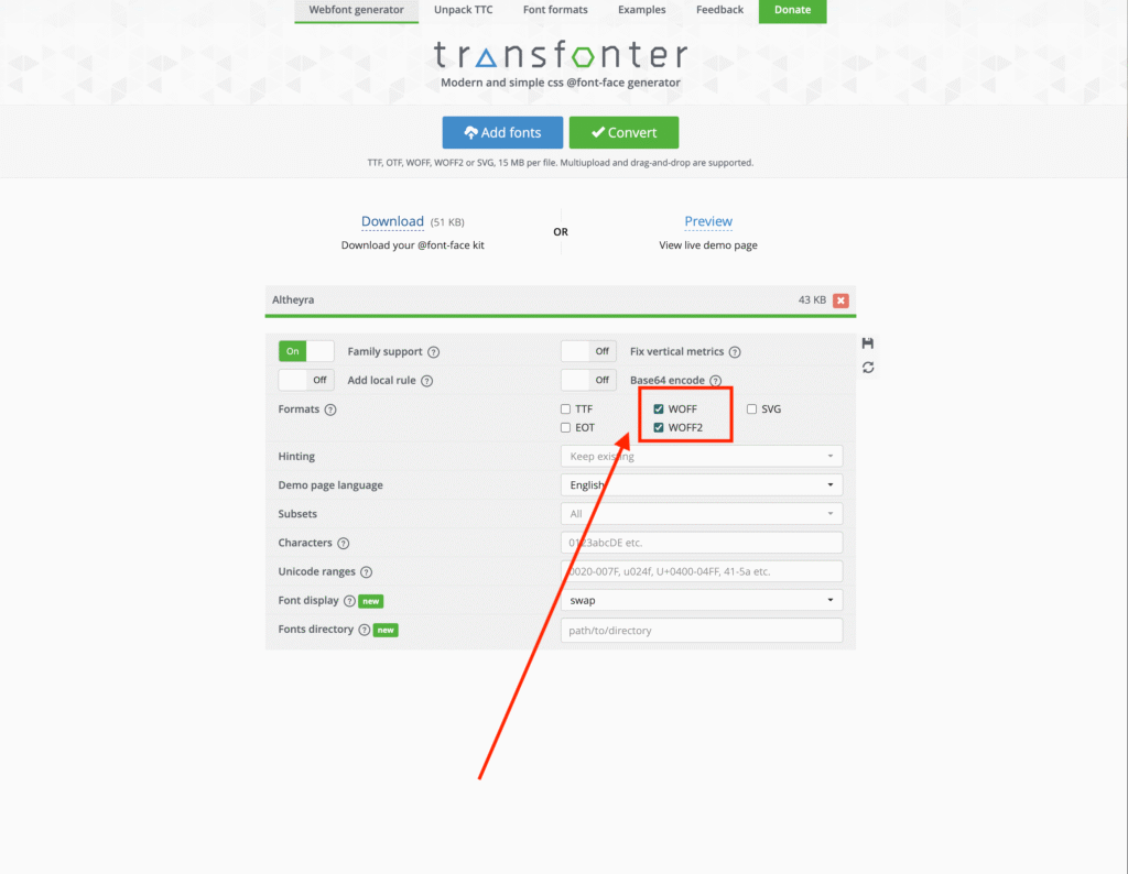 • Make sure both WOFF and WOFF2 are selected.