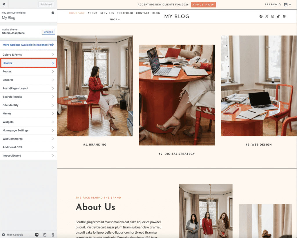 From your WordPress Dashboard, go to Appearance → Customize.