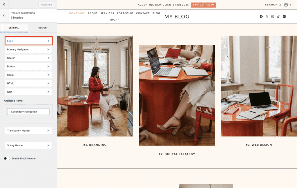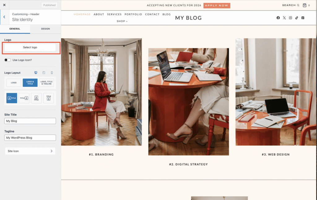 Still in the Customizer, Select Logo.