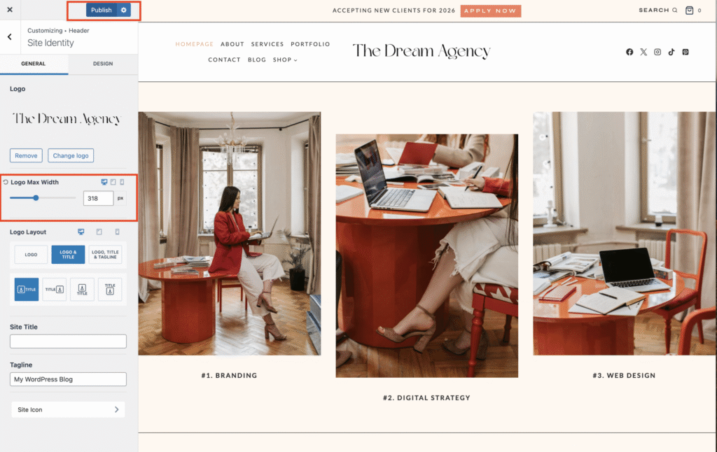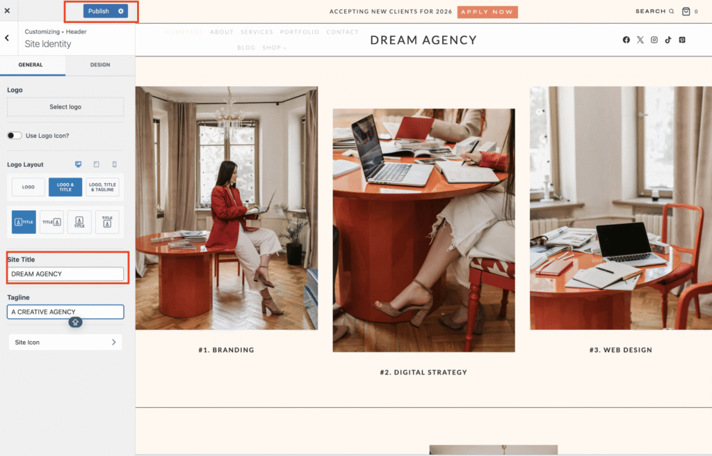 You’ll see a text field where your current site title appears — simply replace it with your business or blog name and click publish to save your changes.