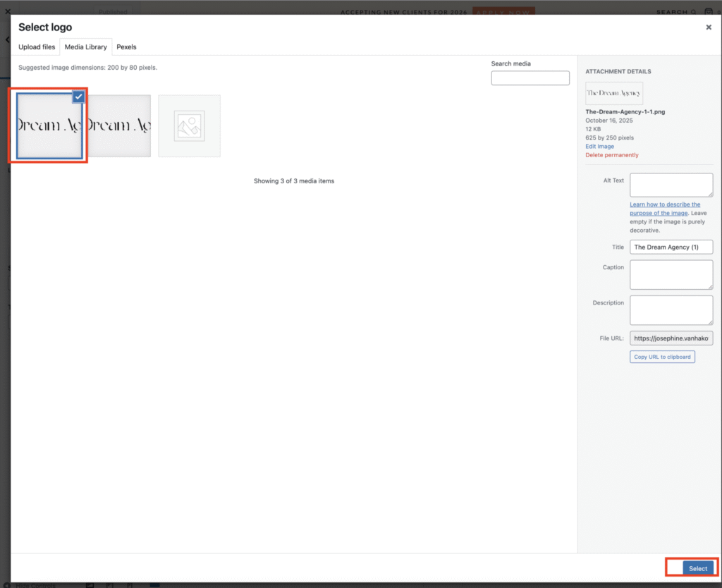 Upload your logo image (PNG or SVG is best for clarity) WordPress recommends dimensions should be 200 by 80 pixels.