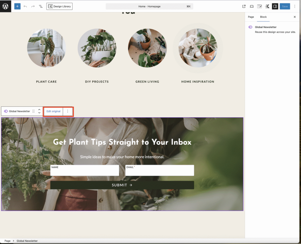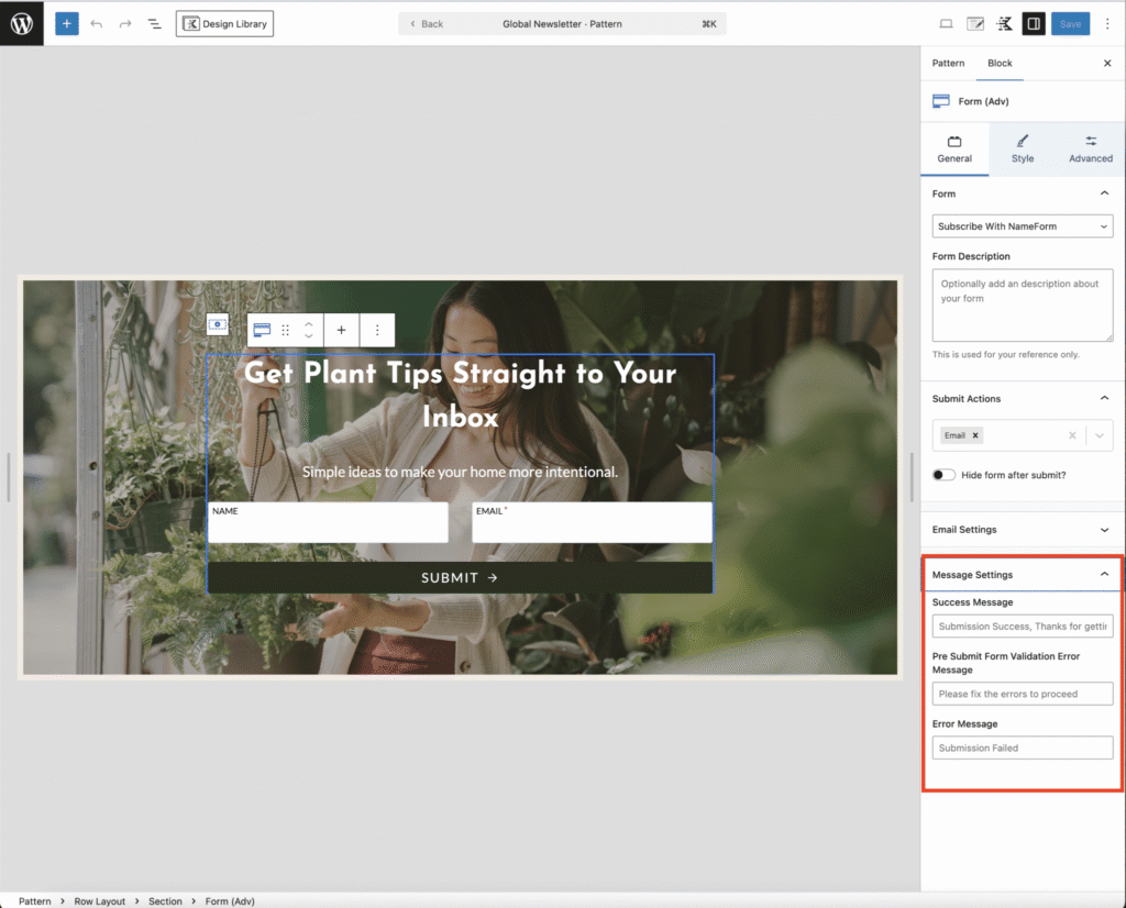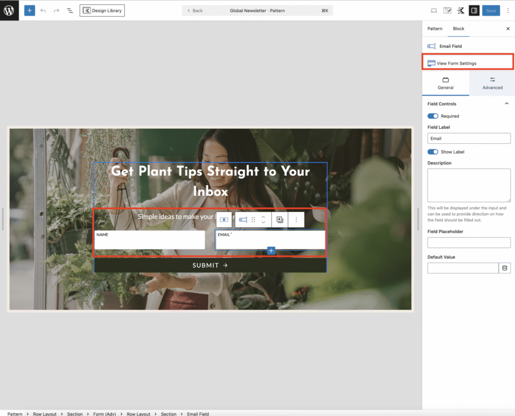 Scroll down to the newsletter form and click on it. You’ll notice the Global Newsletter Label — this means any changes you make here will apply across your entire website wherever the newsletter form appears.