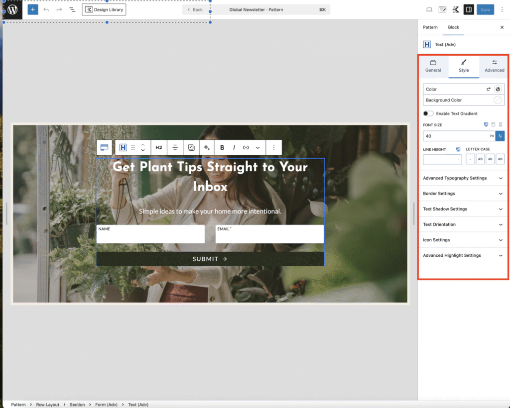 • Fonts and fonts size – in advanced typography tab or leave it as is for it to inherit the default fonts you set up for your website