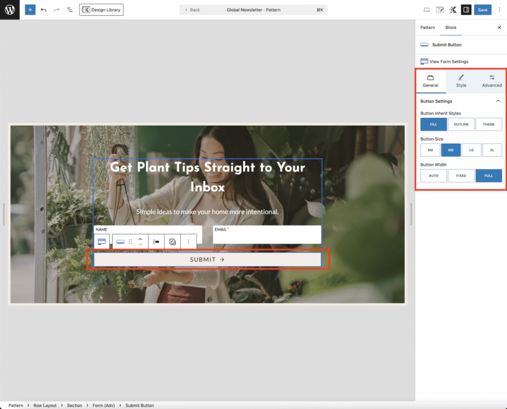 To edit the submit button click on text to open the customization options in the sidebar,