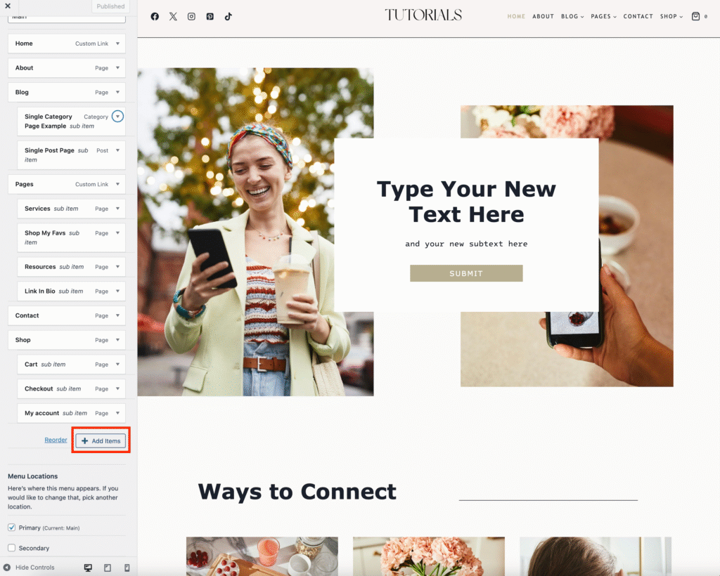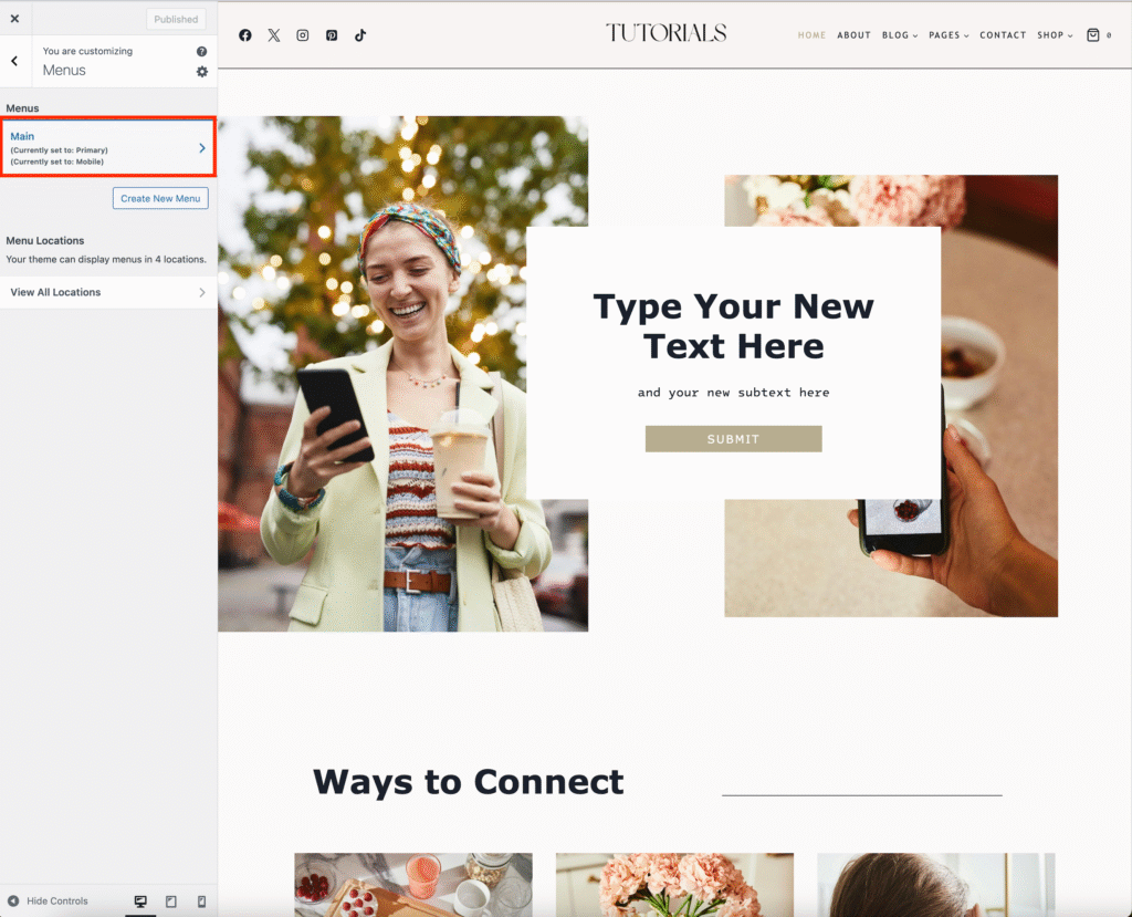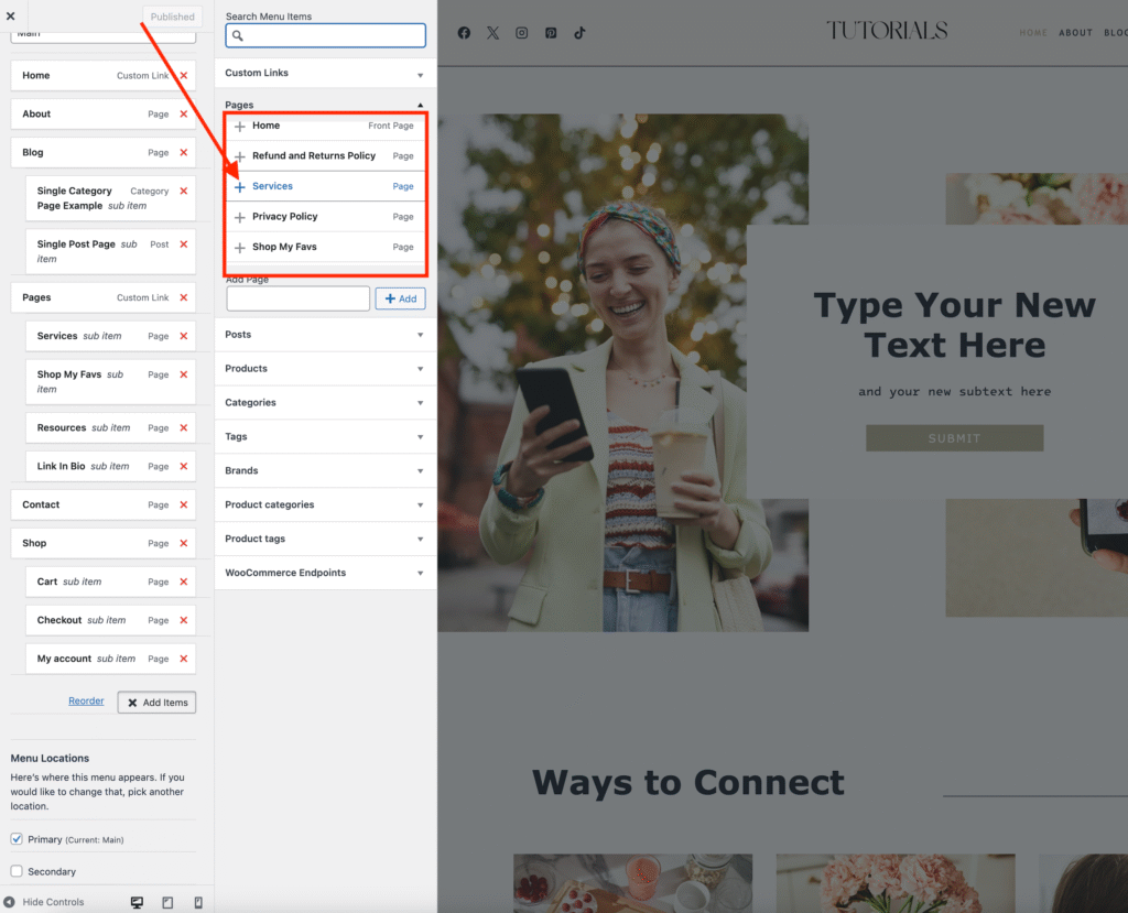 Click Menus and choose your Main Menu (or whichever menu you want to edit).