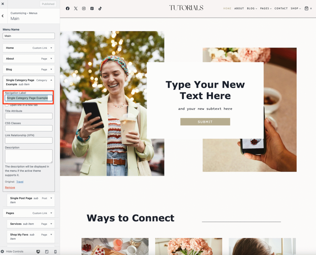 Change the text in the Navigation Label box. Click Publish once done to save your changes.