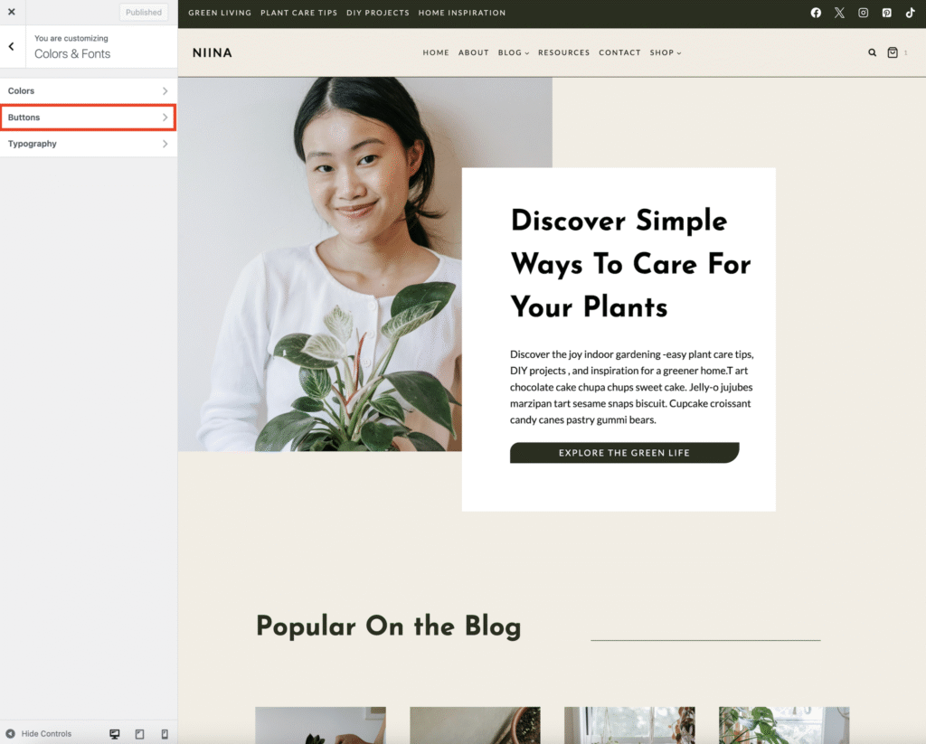 Within the Customizer, go to Colors & Fonts and then select Buttons.