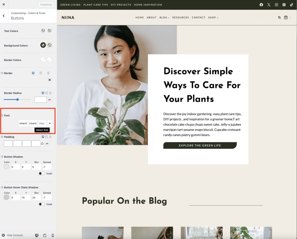 You can also set a custom font for your buttons or allow them to inherit your site’s main font settings.• Adjust the font size, font type and spacing as needed.
