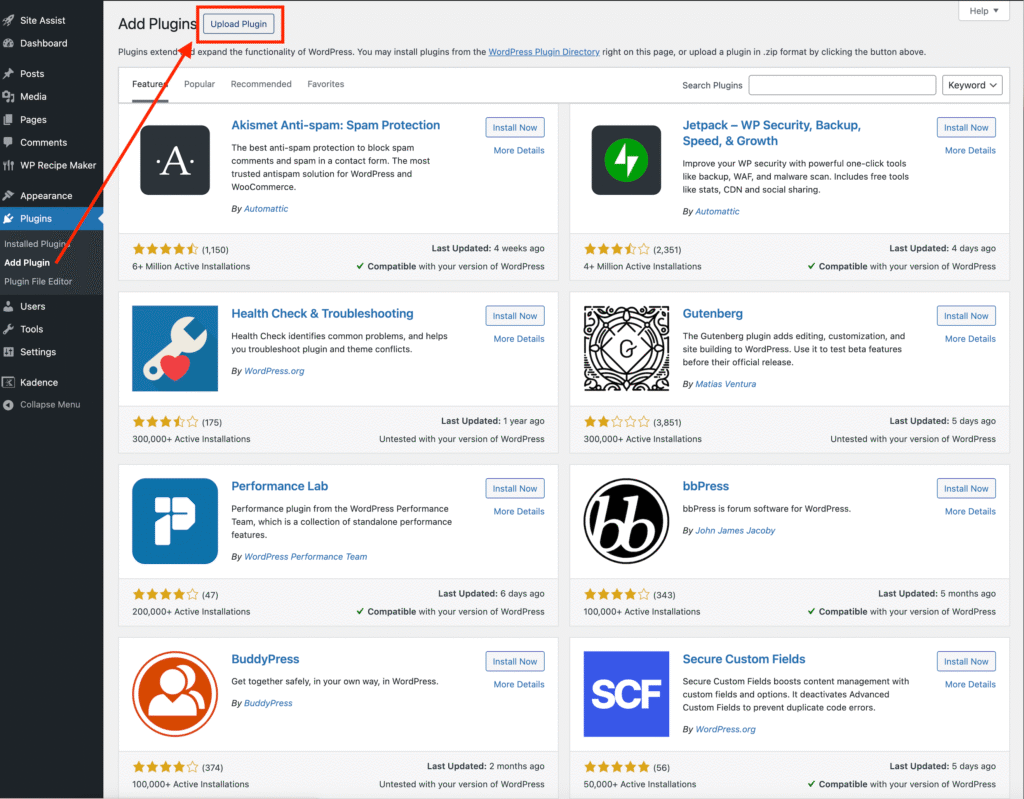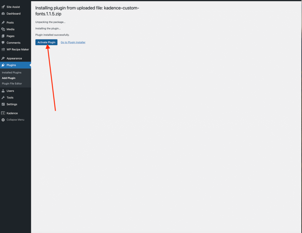 • Click Upload Plugin and select the Custom Fonts .zip file that came with your Kadence Pro purchase.