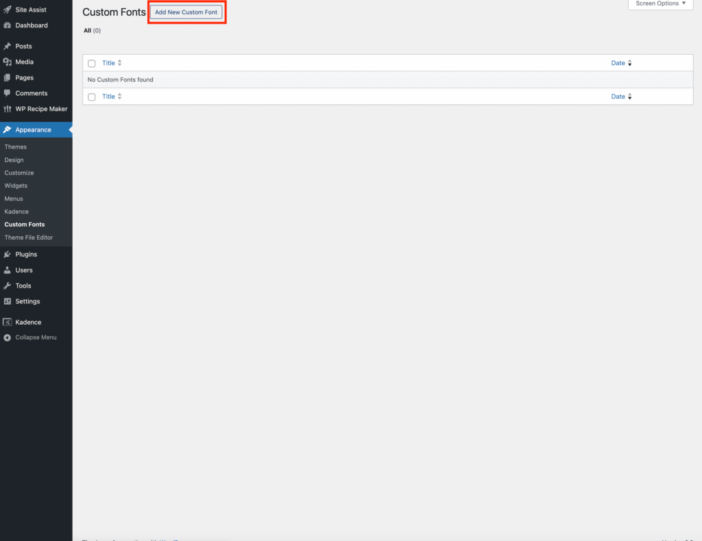Once the plugin is active, go to Appearance → Custom Fonts in your WordPress dashboard.