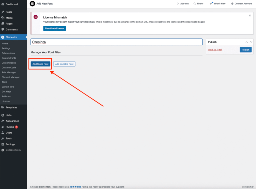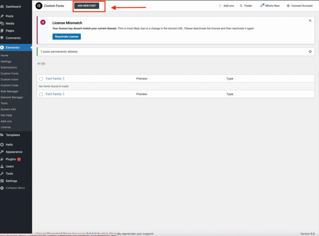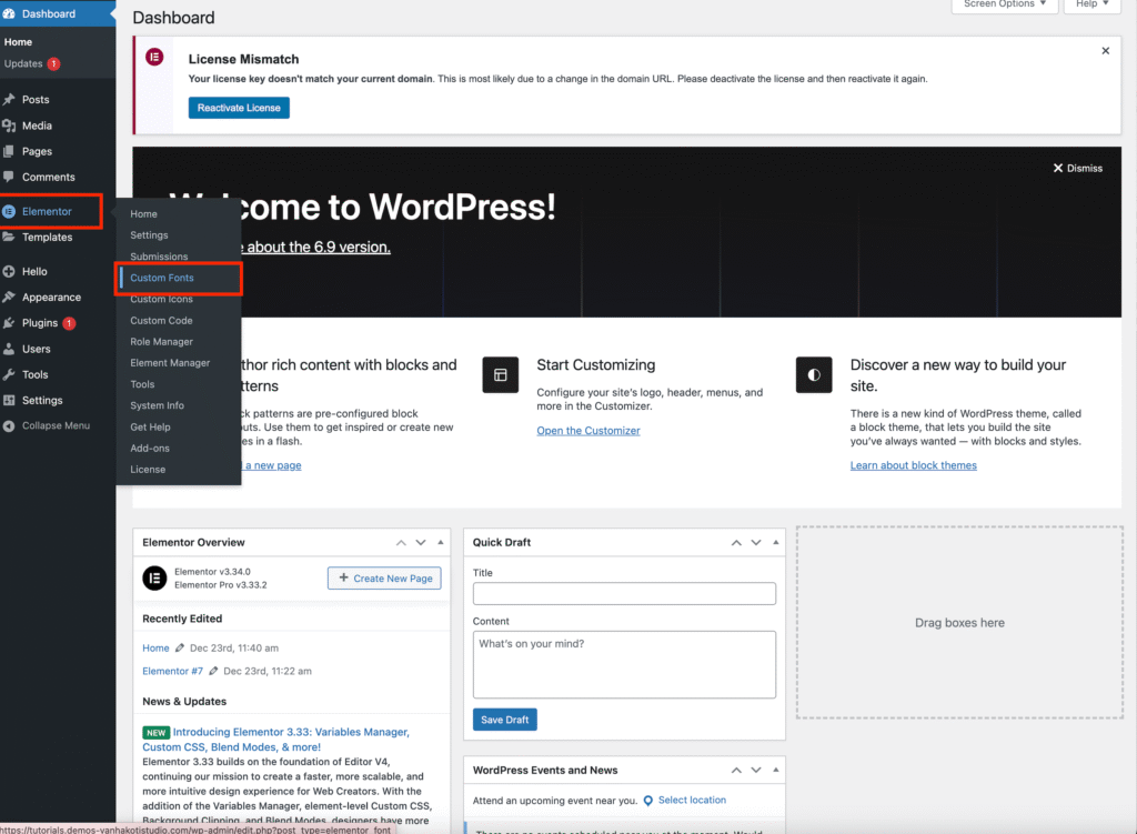 1. From your WordPress Dashboard, navigate to Elementor → Custom Fonts.
